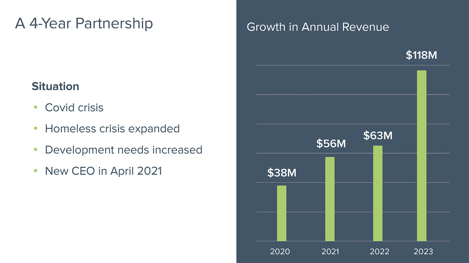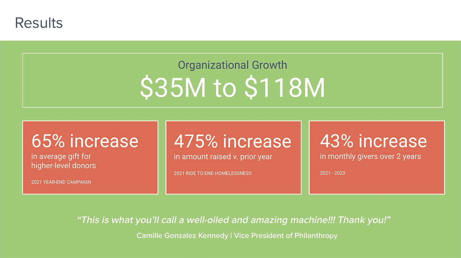 By introducing new fundraising ideas and best practices, we have increased the organization’s level of sophistication so that it can continue to improve results.