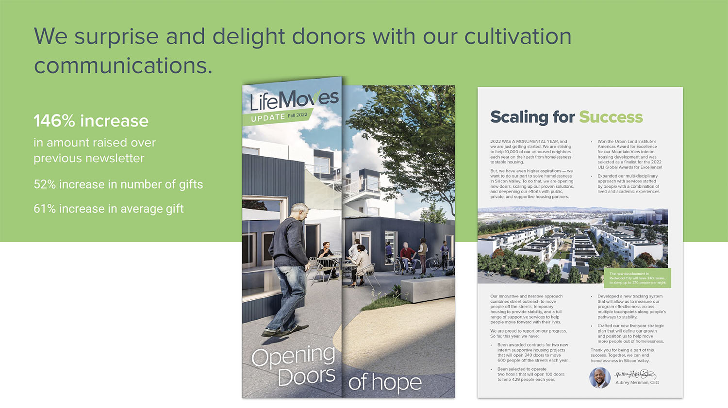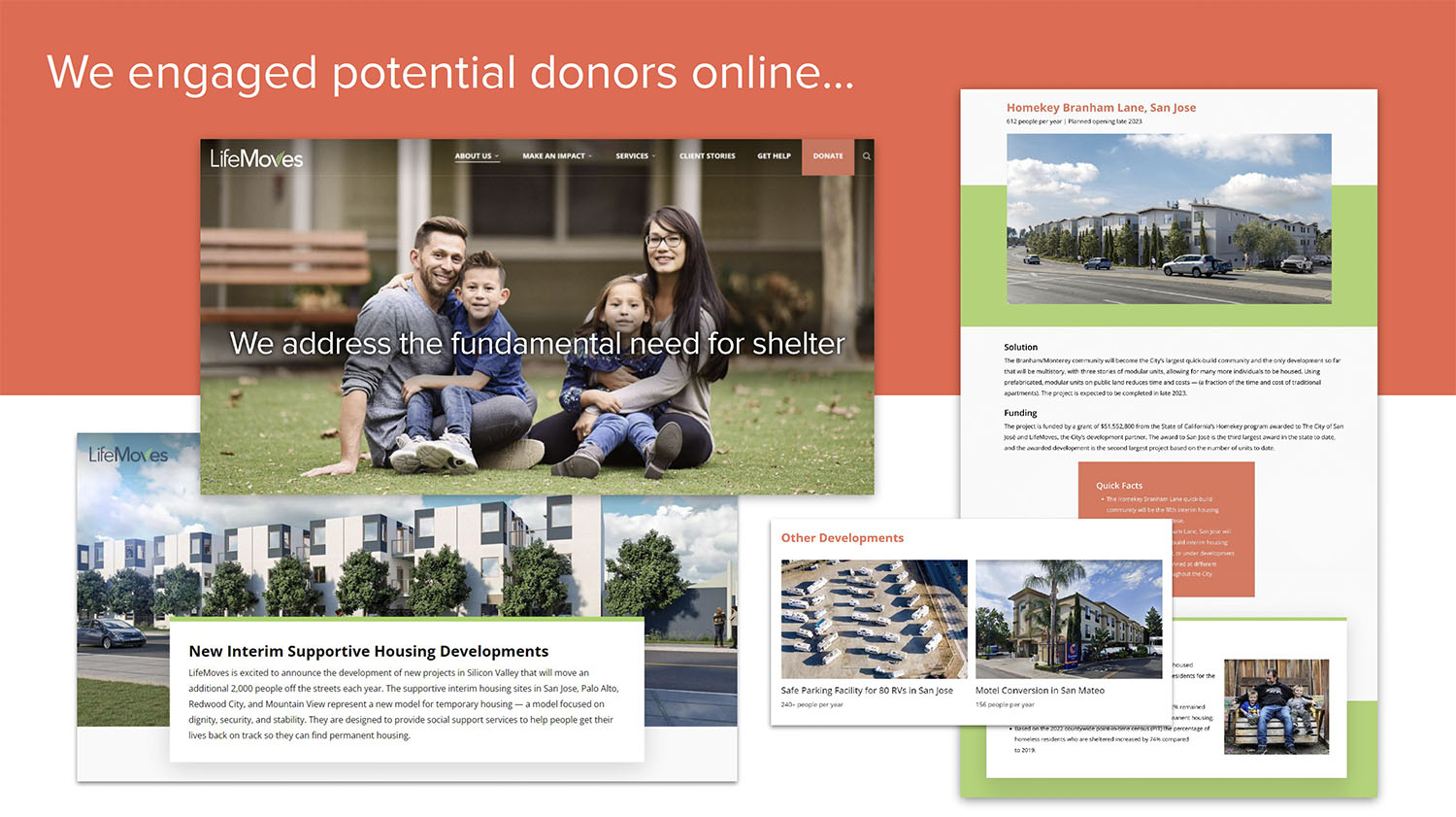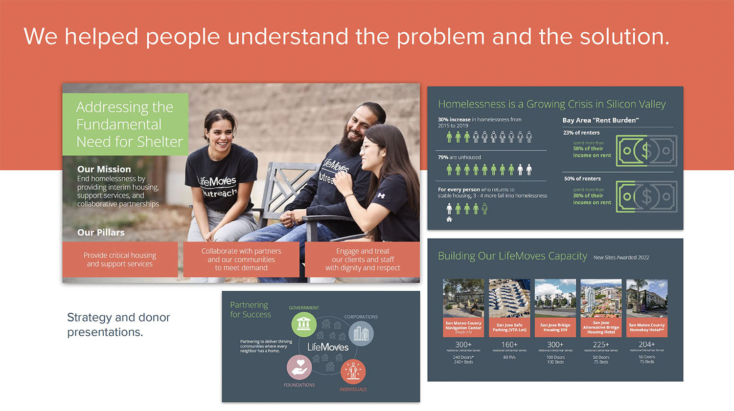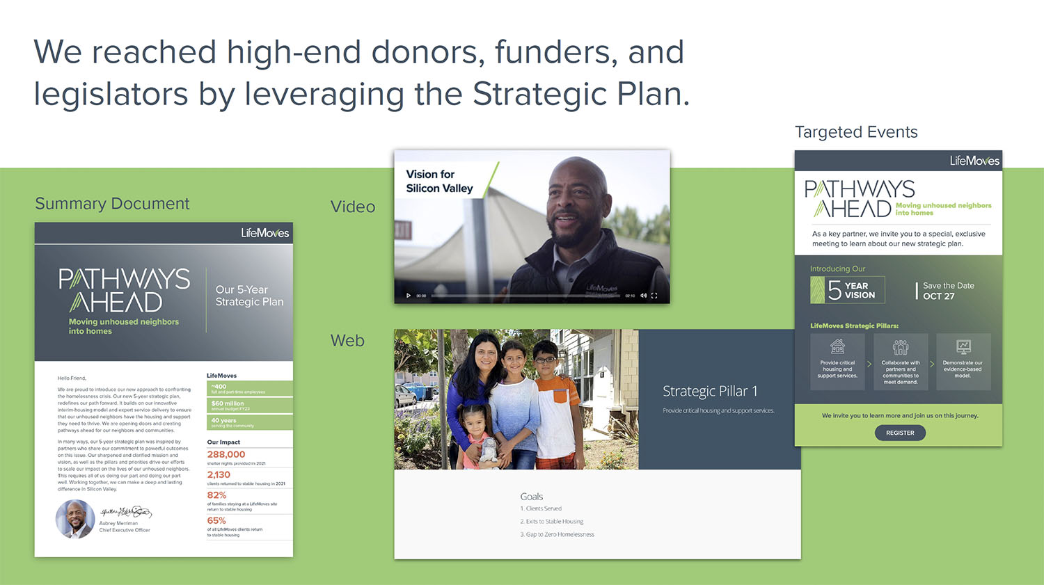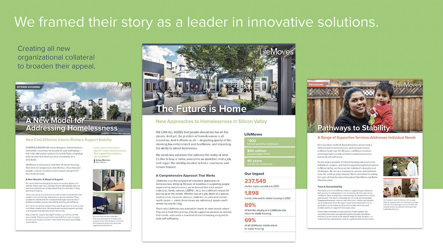 Our brand repositioning work helped reshape perceptions of the organization from a provider of services locally, to a leader that has been recognized by the state with solutions that can be adopted elsewhere. LifeMoves built one of the first modular, interim housing facilities in Northern California (whose opening was attended by the Governor) and won contracts for six more sites, including one of the largest in Northern California.