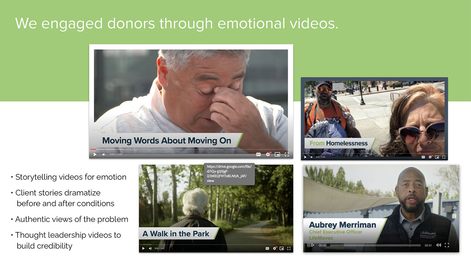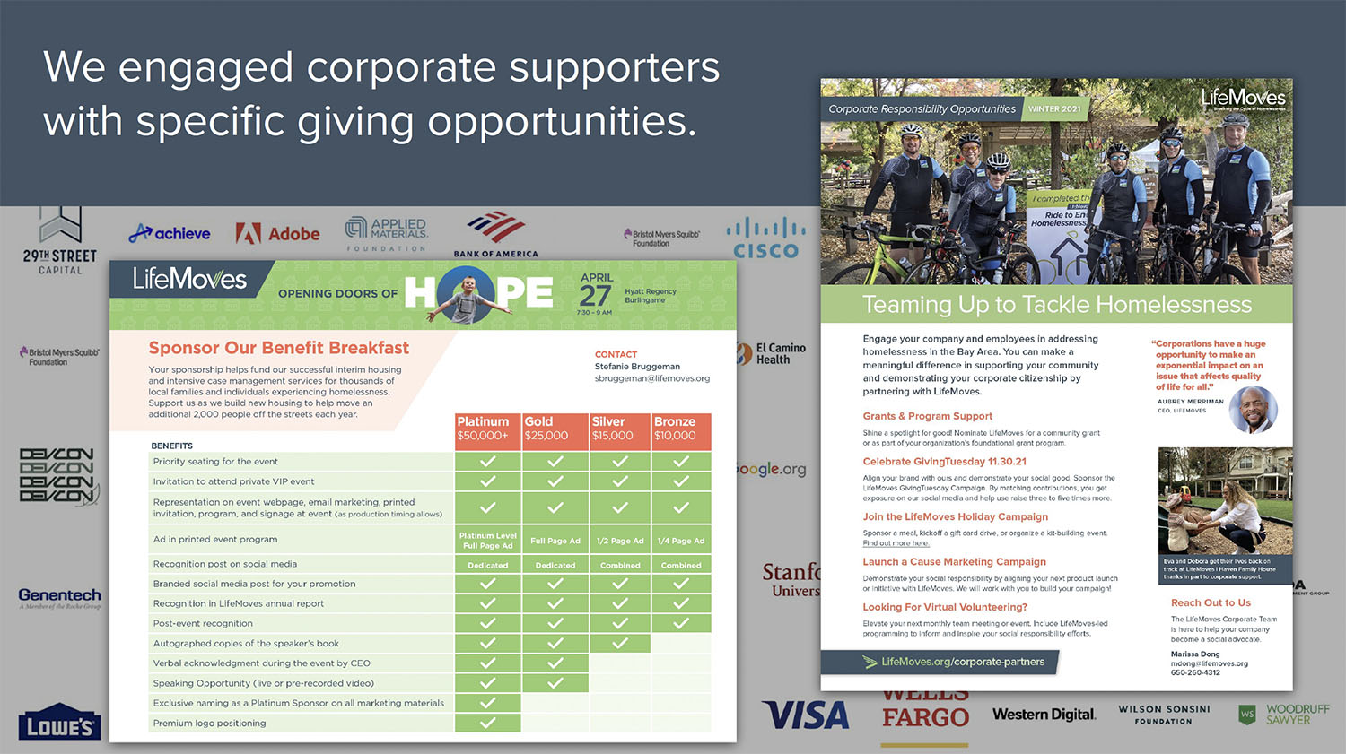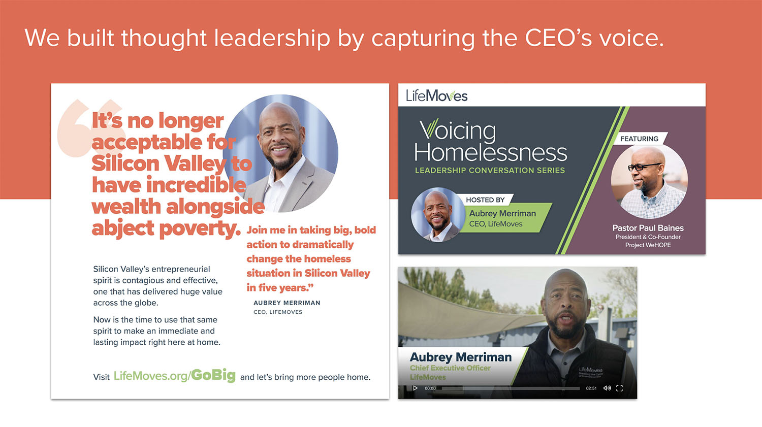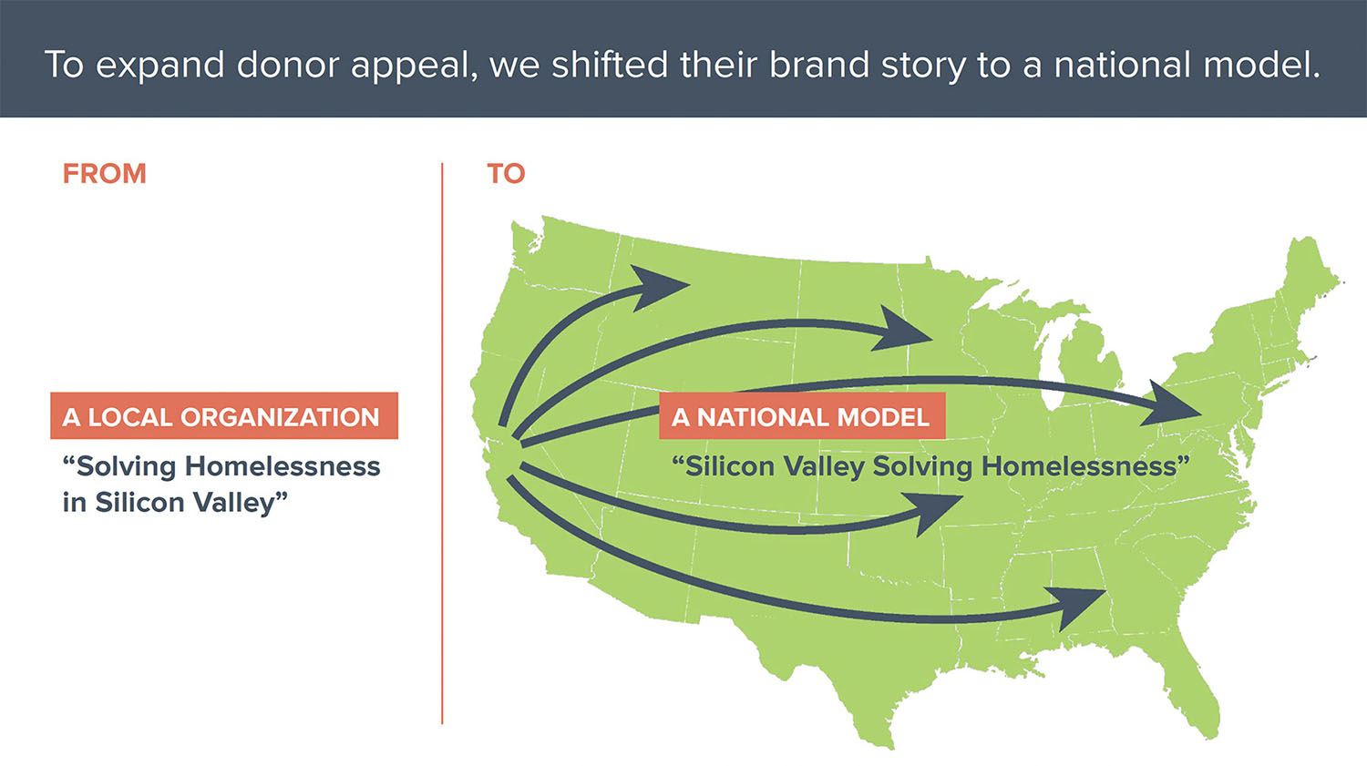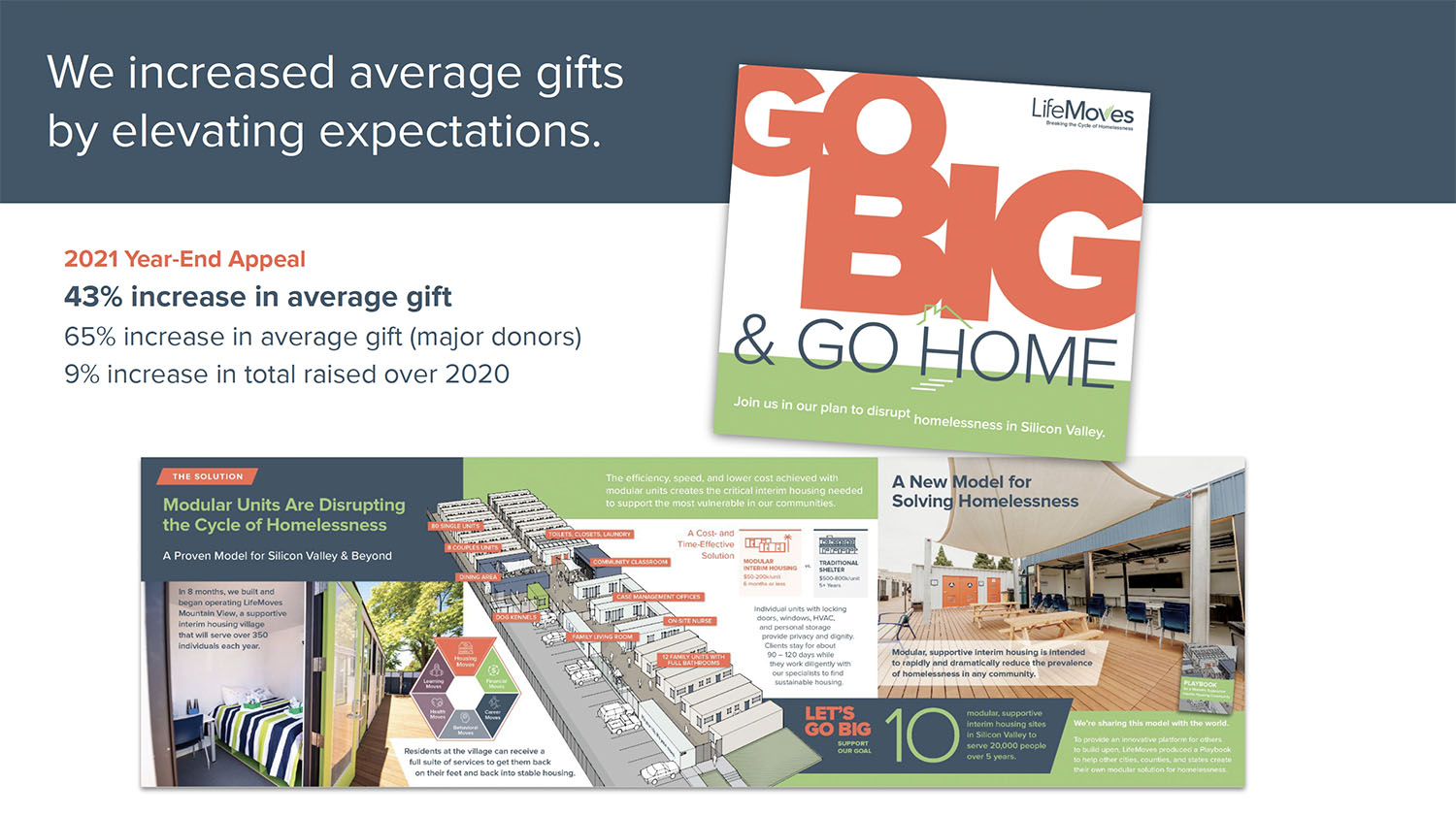 Our brand repositioning work helped reshape perceptions of the organization from a provider of services locally, to a leader that has been recognized by the state with solutions that can be adopted elsewhere. LifeMoves built one of the first modular, interim housing facilities in Northern California (whose opening was attended by the Governor) and won contracts for six more sites, including one of the largest in Northern California.