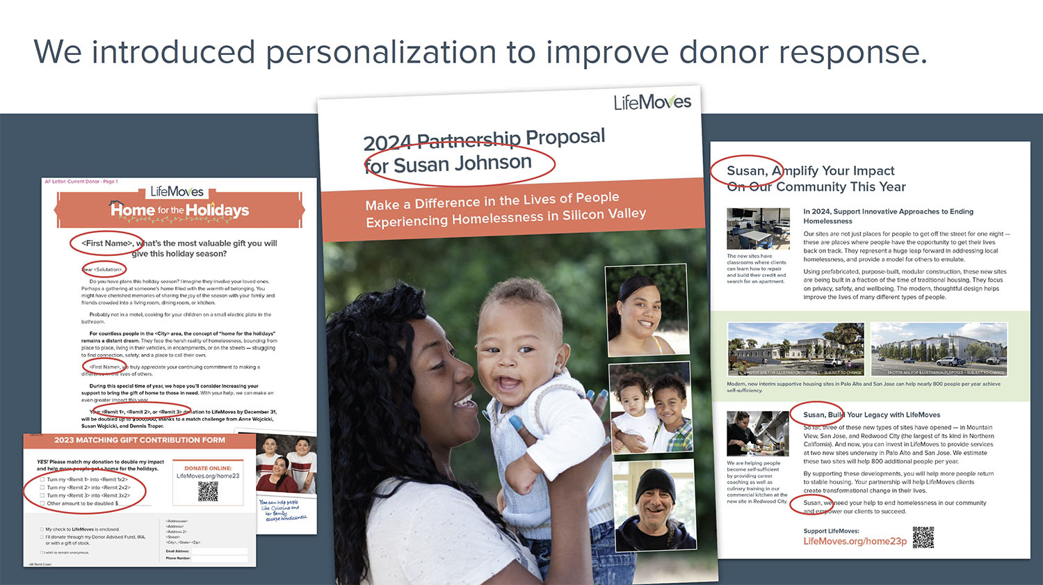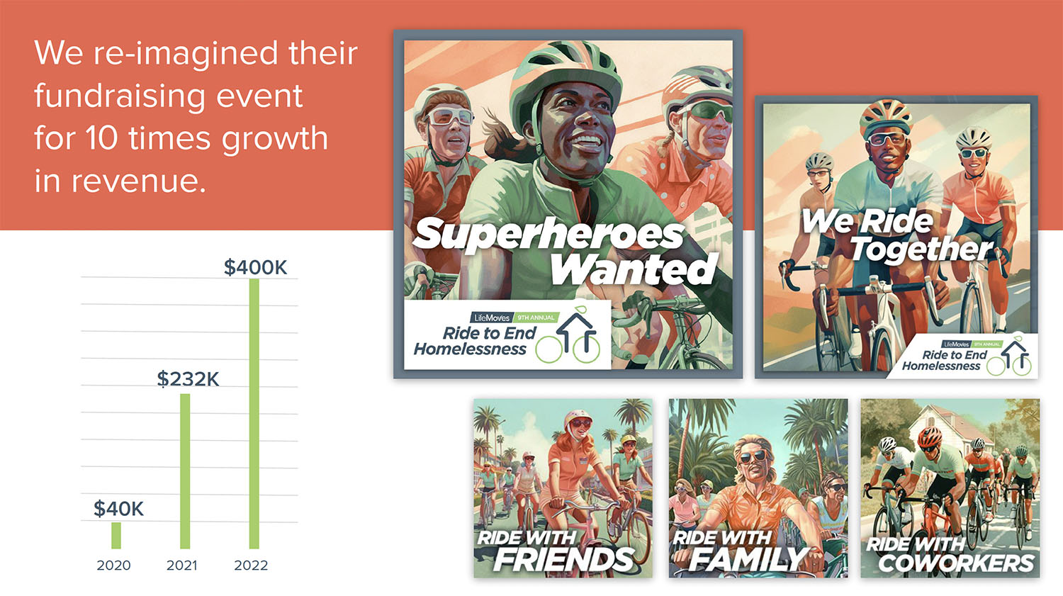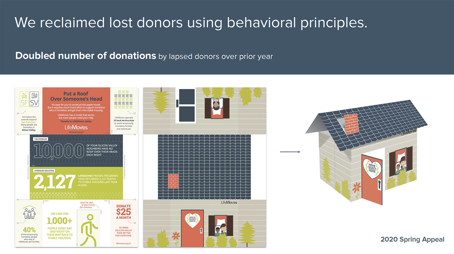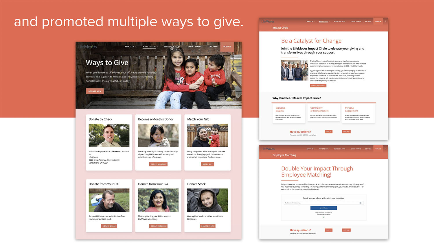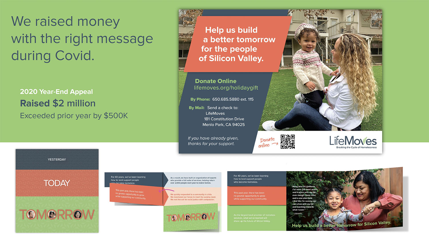LifeMoves first brought on Red Rooster Group to improve its fundraising in March 2020, just as COVID started. The organization needed to keep its 7,000 clients safe and re-trench for the new realities of lockdowns. Since then, the closing of businesses exacerbated the already unprecedented homeless situation due to rising home prices in Silicon Valley. LifeMoves needed to raise money for the short term and develop its brand and fundraising outreach to address growing needs.