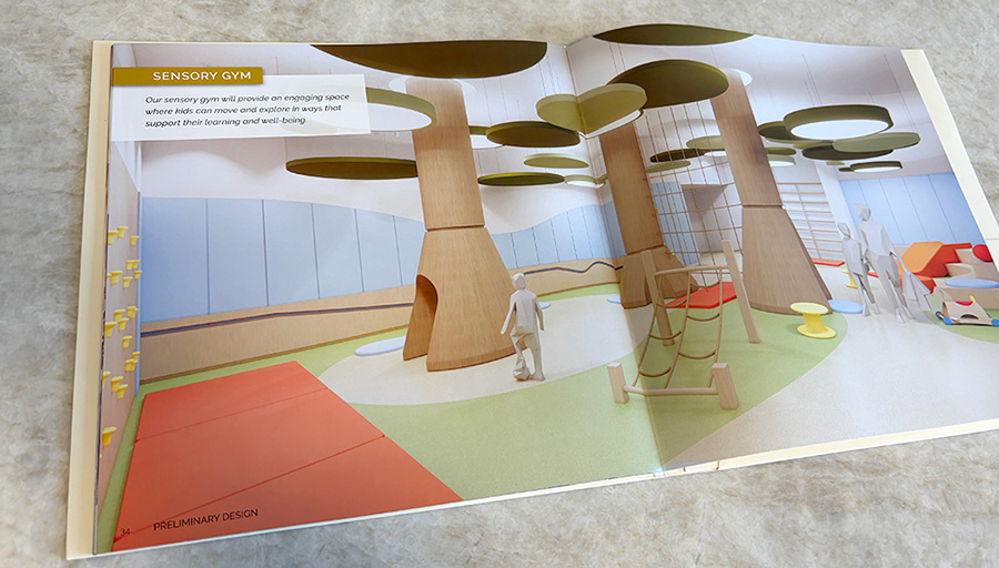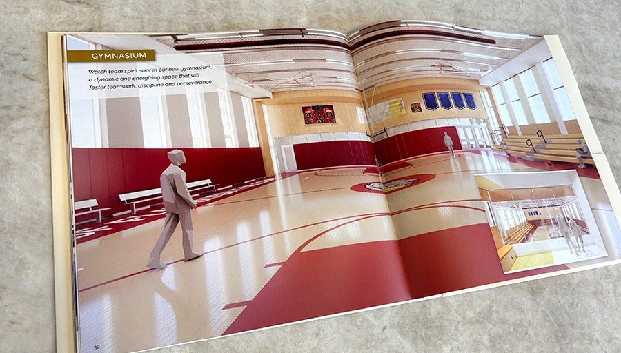The upscale production of the brochure suggests the quality of the new buildings. An extra-thick cover, gold foil stamping, clear foil, vellum overleaf, and satin-finish paper provide a tactile experience to engage affluent donors.